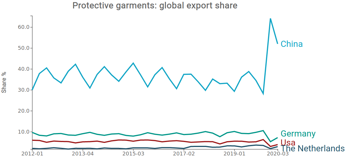 Germany is followed by the United States, with a world trade share of more than 12% and a production specialization similar to Germany, but with a greater importance of medical equipment exports. In third place we can find China, for which the production specialization is clearly linked to personal protective equipment: in 2019 the country held about 35% of global exports of the sector.