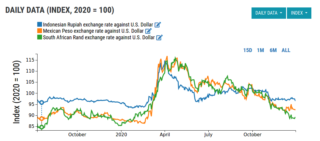 - the currencies of emerging countries that went in the opposite direction: after a phase of strong depreciation, they gradually returned to the values of the beginning of the year. Three of them, in particular, are characterized by this path: the Indonesian Rupee, the South African Rand and the Mexican Peso.