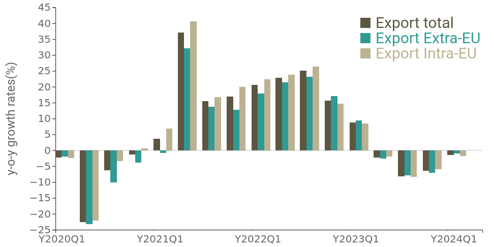 In the graph shown it is clear that 2023 was a downward year, culminating in the third quarter, in which total EU exports recorded a -8% trend in euro values. The fourth quarter is also strongly negative (-6%), while from the first months of 2024 it seems that the trend is reversing, with EU exports which, although in negative territory, settle at - 1.4% trend in euro values.