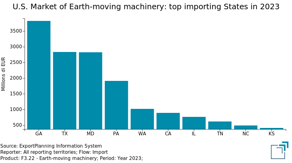 In particular, in 2023 we note the record of imports of Earth-moving machinery expressed by Georgia [GE] (3.8 billion euros), Texas [TX] (2.8 Bn €) and Maryland [MD] (2.8 Bn €), followed by Pennsylvania [PA] (1.9 Bn €), Washington [WA] (1 Bn €), California [CA] (0.9 Bn €), Illinois [IL] (0.8 Bn €) and Tennessee [TN] (0.6 Bn €).