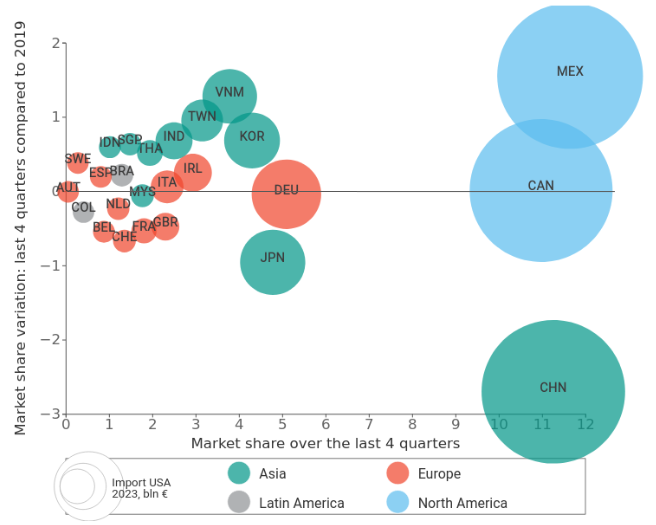 The analysis of the market shares of the main countries exporting to the United States, visualized in the bubble chart, provides a clear overview of how the positioning of key active markets has changed. On the x-axis, the market share held by each exporter in the last available domestic year is shown, while on the y-axis, the variation in that share between the last four quarters and the last pre-pandemic year is indicated. The size of the bubbles is proportional to the value of American imports in the year 2023.