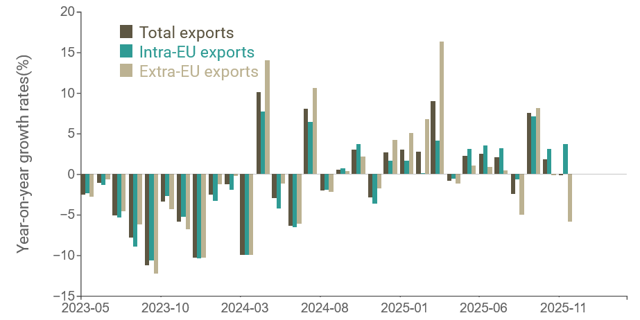 The greater vitality of intra-EU trade helps partially offset the weakness of exports to extra-EU markets, reducing the overall volatility of the Union’s foreign trade.