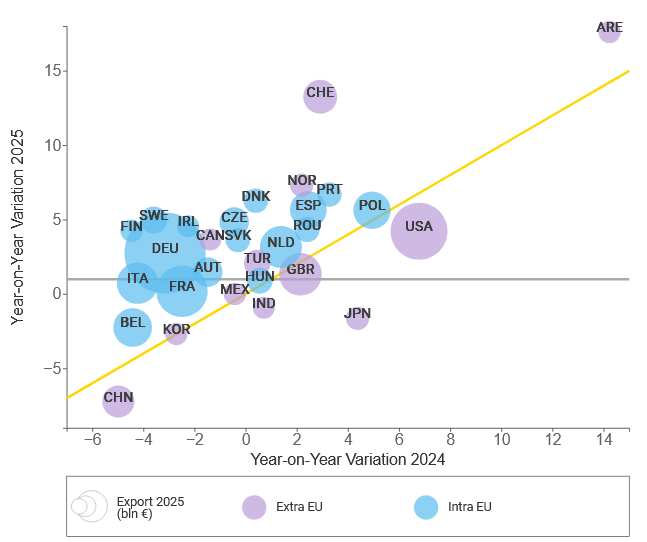 The distinction between intra-EU and extra-EU exports represents a key lens through which to understand the current cyclical phase. Data show that in 2025 intra-EU exports maintained a generally more favorable trajectory compared to exports directed to non-European markets, which continue to be more affected by global uncertainties.