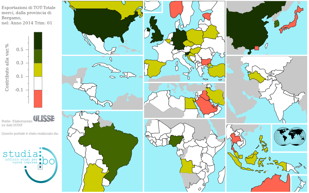 Cambio Controllo risultati Export territoriale Asia Pianificazione Europa Siulisse Africa Congiuntura Congiuntura InternazionaleI dati pubblicati dall'Istat sulle esportazioni delle varie province italiane confermano nel II trimestre del 2014 le positive performance delle esportazioni della provincia di Bergamo, uno dei territori “trainanti” le vendite all'estero dell'Italia. Dopo aver messo a segno nel primo trimestre dell'anno una variazione tendenziale del +6.1% in euro, nel secondo trimestre le vendite all'estero delle imprese manifatturiere localizzate nella provincia di Bergamo hanno registrato un nuovo aumento tendenziale: +3.2% rispetto al corrispondente periodo del 2013.