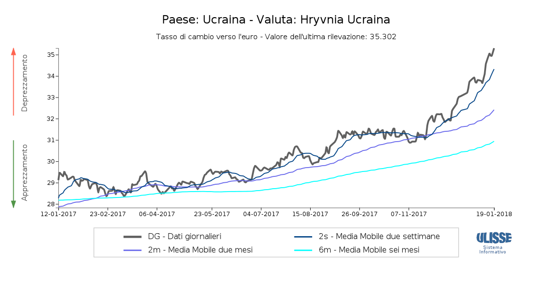 In un contesto così incerto a farne le spese è il Hryvnia, la valuta ucraina, che da anni ha intrapreso una dinamica di deprezzamento sia nei confronti del dollaro che nei confronti dell'euro. Questa settimana tale trend di indebolimento è aumentato, infatti, come è possibile osservare dal grafico sotto riportato, il Hryvnia si è indebolito in pochi giorni del 4.4% nei confronti della valuta unica e del 2.8% nei confronti del biglietto verde, chiudendo la settimana con valori rispettivamente pari a 35.3 Hryvnia per euro e 28.8 Hryvnia per dollaro.