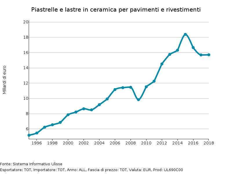 Di contro, l'anno scorso il commercio mondiale di Piastrelle e lastre in ceramica espresso in euro si è attestato su valori inferiori ai 16 miliardi di euro,