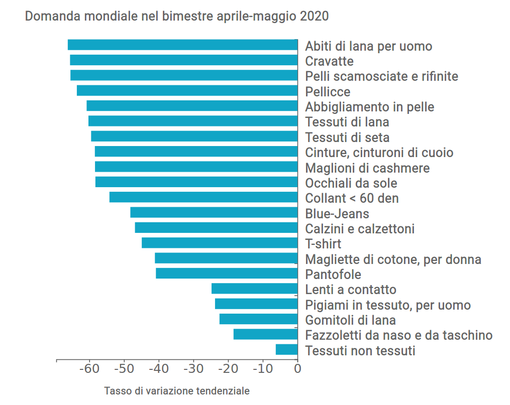 Gli abiti di lana per uomo (completi, giacche e pantaloni) hanno subito un riduzione di oltre il 60%. Crolli simili hanno caratterizzato gli scambi mondiali di cravatte, pellicce, tessuti di lana e seta e i maglioni di cashmere, segnalando come siano state le aree di business più esclusive quelle maggiormente colpite. Anche la filiera delle pelli e pelletteria è risultata duramente colpita, con crolli sopra al 50% per le pelli di maggior qualità, gli abiti in pelle e le cinture. Leggermente meno colpiti i prodotti più d’uso comune come i blue-jans, le T-shirts e le magliette di cotone, con crolli che si avvicinano, comunque al 50%. Crolli meno drammatici hanno riguardato prodotti di abbigliamento da casa, quali pigiami in tessuto e pantofole, che hanno beneficiato dal maggior tempo trascorso a casa.