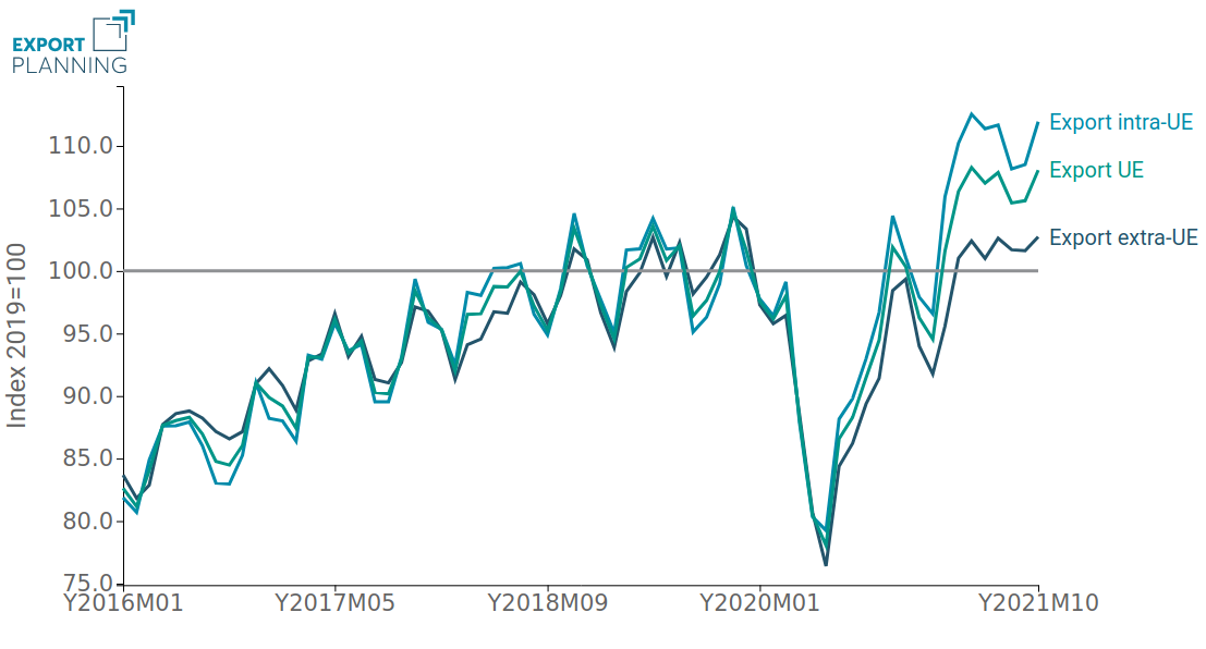 Lo scenario delle esportazioni europee nel quarto trimestre 2021 ci mostra una progressiva normalizzazione del ritmo di crescita negli ultimi mesi, tuttavia i valori rimangono maggiori rispetto a quelli registrati nel 2019.