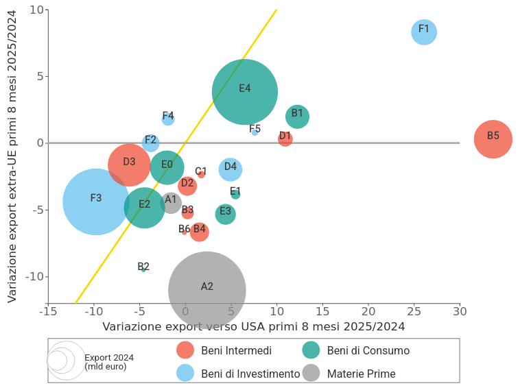 Sull’asse orizzontale è riportata la variazione verso gli Stati Uniti, mentre sull’asse verticale quella verso gli altri mercati extra-UE (esclusi gli USA). La dimensione delle bolle rappresenta il valore complessivo delle esportazioni nel 2024, evidenziando così il peso relativo dei diversi comparti.