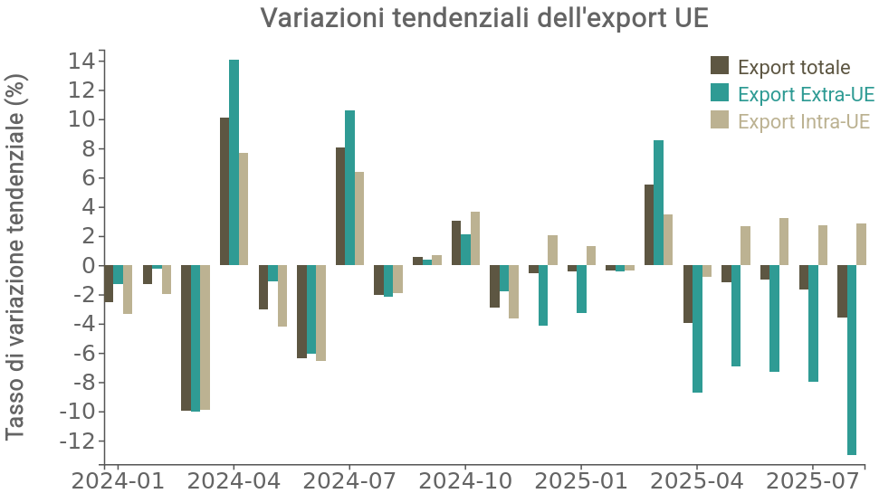 Il primo grafico mostra le variazioni tendenziali dell’export mensile UE in euro, distinguendo tra esportazioni intra-UE (verso i partner comunitari) ed extra-UE (verso paesi terzi).