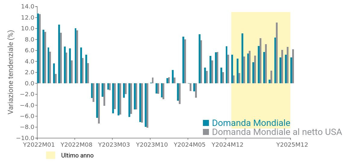In tale periodo, la domanda mondiale di beni al netto degli Stati Uniti ha registrato una crescita più contenuta. Nel periodo gennaio-marzo, infatti, i flussi straordinari di importazione USA hanno sostenuto in misura rilevante la domanda mondiale, configurandosi come un importante fattore di supporto alla crescita in una fase caratterizzata da elevata incertezza internazionale. Tuttavia, a partire dal secondo trimestre tale effetto si è sostanzialmente esaurito.