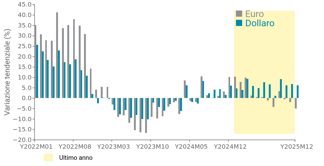 Se la sostanziale resilienza del commercio mondiale di beni in termini di volumi reali rappresenta un elemento di luce nel quadro congiunturale internazionale, un fattore di ombra emerge dall’analisi delle dinamiche degli scambi in valore, espresse in dollari ed euro. La svalutazione del dollaro, avviatasi già nel corso del 2024 e intensificatasi negli ultimi mesi del 2025, ha determinato una significativa divergenza tra le variazioni del commercio mondiale misurate nelle due valute, influenzando la lettura delle performance nominali degli scambi internazionali.