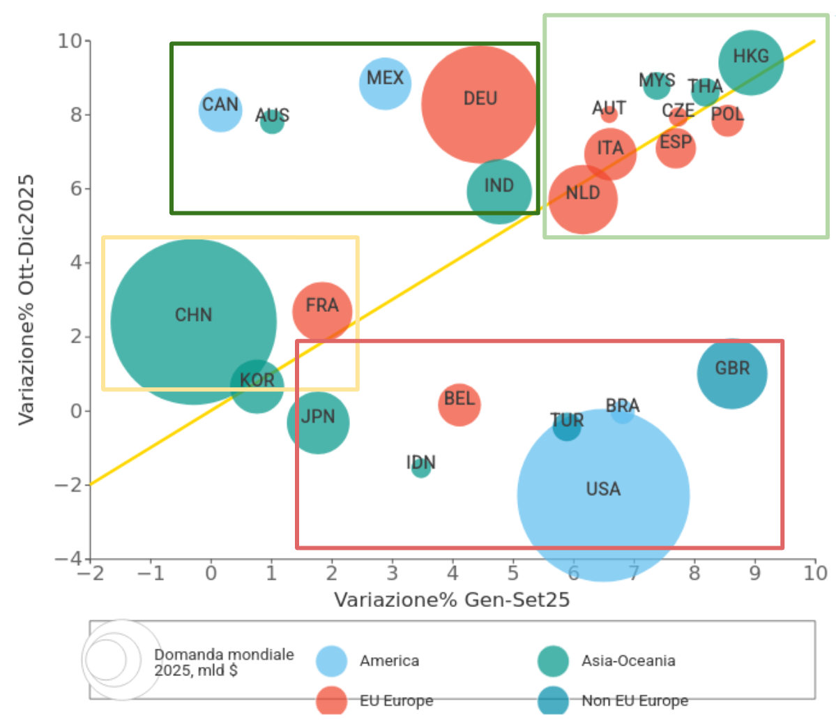 La bisettrice (evidenziata in giallo) costituisce un riferimento interpretativo chiave: i paesi collocati lungo la bisettrice mostrano una crescita sostanzialmente stabile rispetto alla prima parte dell’anno; quelli al di sotto indicano un rallentamento della dinamica espansiva, mentre quelli al di sopra segnalano un’accelerazione della domanda. La dimensione di ciascuna ball è proporzionale al valore complessivo importato dal paese nel 2025.