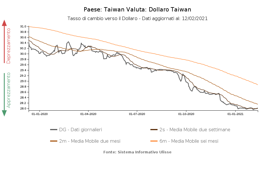 Come si nota dal grafico, il rafforzamento a partire dalla primavera del 2020 è stato considerevole e continuo, per poi arrivare ad una stabilizzazione, a inizio 2021, su livelli di massimo storico. La valuta è attualmente scambiata a 28 TWD per USD, valore che rappresenta un massimo per gli ultimi 20 anni. Ciò sta suscitando la preoccupazione della banca centrale per gli effetti sulla competitività dell’export, tanto che l’istituto si sta impegnando per contrastare questo rally tramite interventi sui mercati forex. Le riserve di valuta estera del paese, già prossime ai 500 miliardi di dollari alla fine del 2019, hanno visto nel 2020 un ulteriore aumento di 50 miliardi, secondo quanto riportato dalla banca centrale.