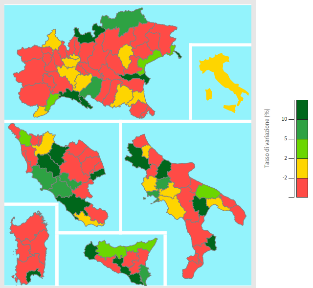 Tra le province più penalizzate si segnalano - nell'ordine - Frosinone, Pesaro-Urbino, Massa-Carrara, Pistoia, Livorno e Ancona, con cali tendenziali a due cifre nei tassi di variazione.