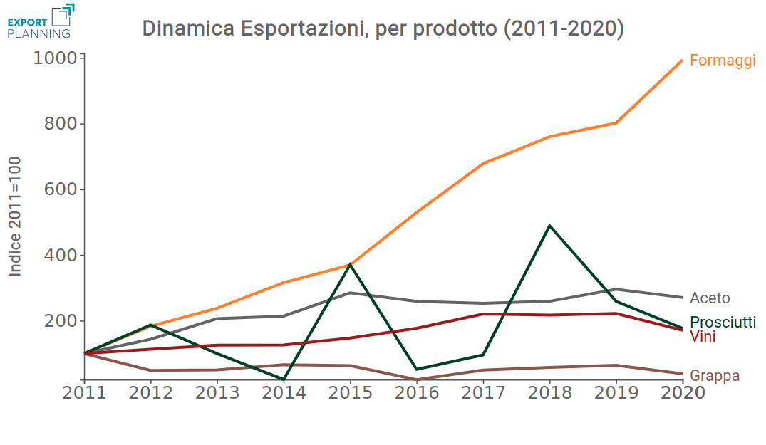 Il grafico riportato illustra la dinamica delle vendite italiane in Cina, riportando a 100 il valore dell’export nel 2011. Come mostrato, i beni che osservano la migliore dinamica sono i formaggi, con le esportazioni che toccano quota 21 milioni di euro nel 2020. A guidare la crescita sono in particolare la mozzarella (da sola vale la metà delle vendite del comparto) e formaggi stagionati come il pecorino e il Grana Padano. La pandemia non ha arrestato la domanda cinese per questa tipologia di prodotti, che segna un incremento tendenziale delle esportazioni pari al +23%, a fronte di una diminuzione delle vendite di grappa e di prosciutti rispettivamente del -40% e -31%. Più contenuto, sebbene ugualmente significativo, il calo registrato dai vini (-23%) e dall’aceto (-8%), due beni i cui scambi con la Cina sono stati caratterizzati da ritmi di crescita pressoché costanti nell’arco dello scorso decennio: mentre l’export di vini è passato dai circa 60 milioni di euro del 2011 ai 100 milioni del 2020, le importazioni cinesi di aceto sono più che raddoppiate (dai 5 milioni di euro ai circa 14 milioni di euro).